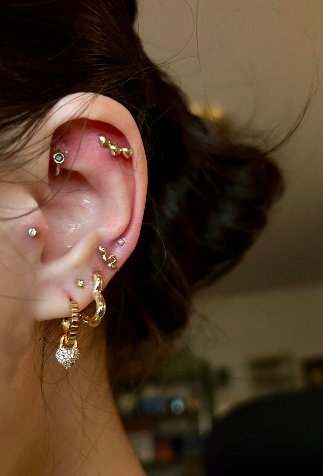 Piercing is really cute! Giving it 4/5 stars because I was unable to select the post length (only sold in 6.5mm), so its too long on my upper lobe and rotates constantly. For another $68 you can order a shorter post… or… you can spend a little more and order another earring with a shorter post and swap it out. Outside of the post length, the stud is super cute and comfortable.