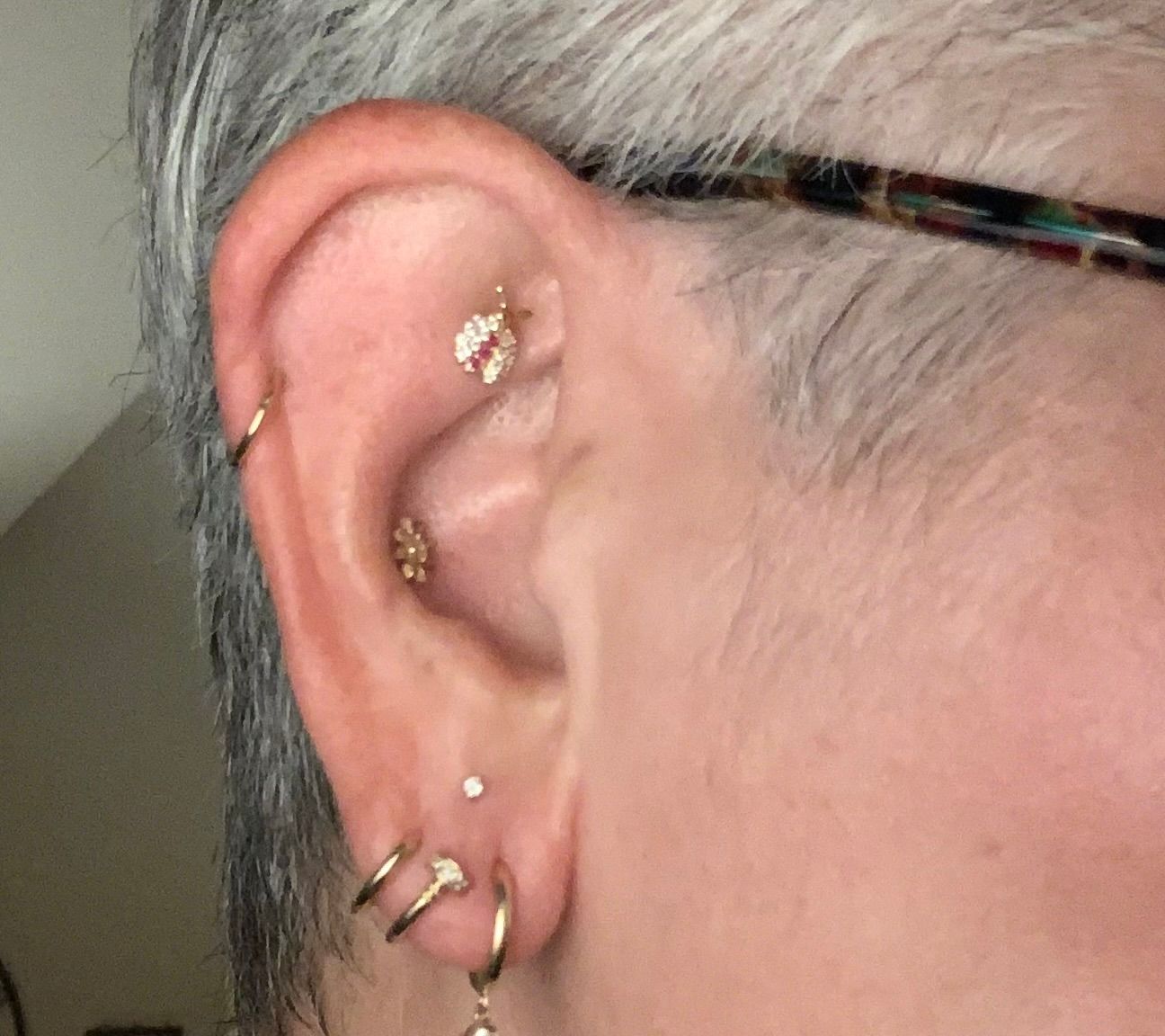 Internally threaded solid 14 karat gold stud piercing. Suitable for ear, helix, cartilage, conch, lobe, tragus and daith. Please note this earring is sold individually.