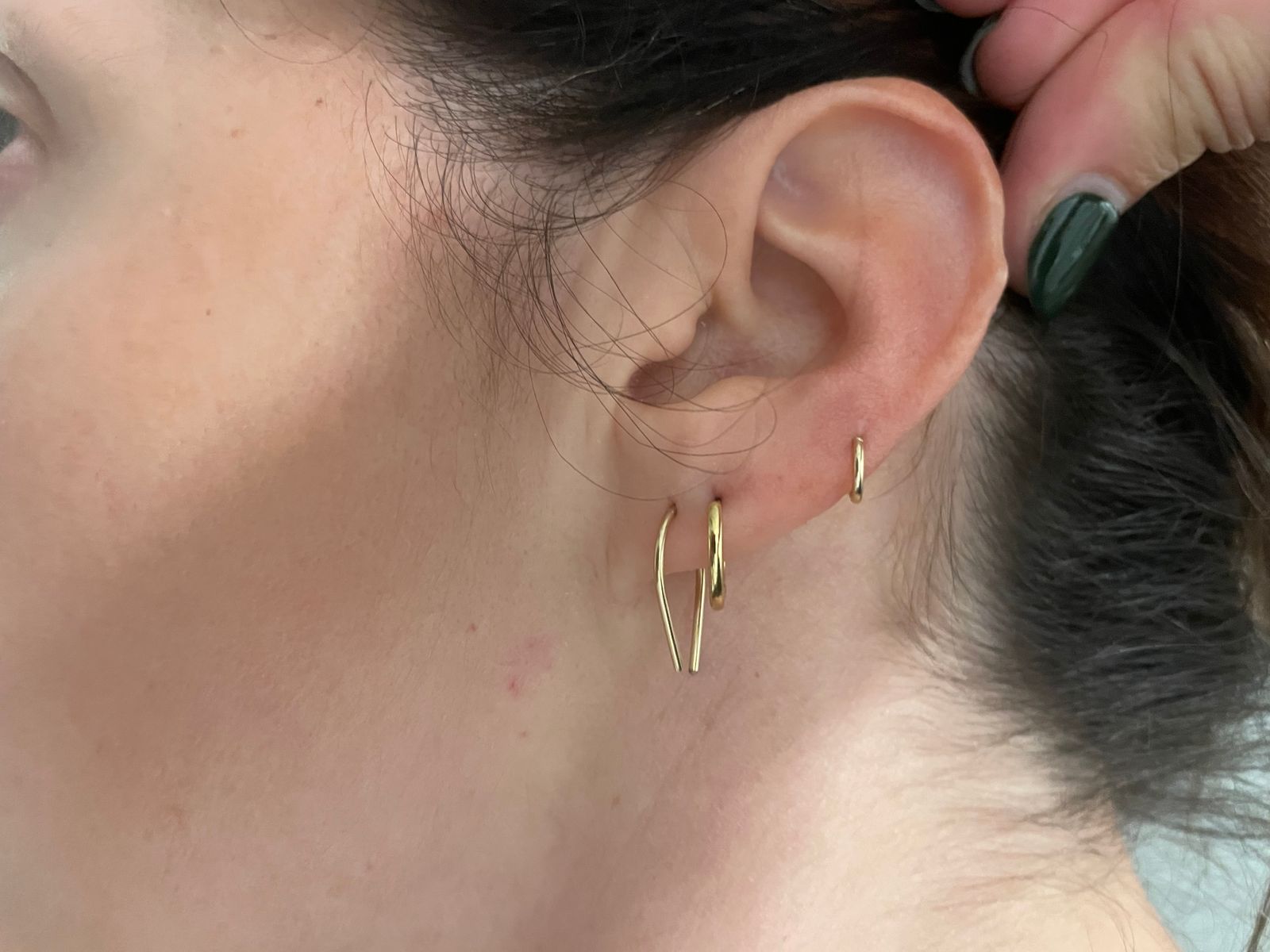 I love these hoops! Classic and easy to use with the hinge! As much as I love these, I learned that they don’t work well will my fleshy ear lobes. Even the largest diameter was causing the piercing to curve too much for comfort. This is not representative of the hoops themselves, but more the journey I took to building my stack. Now, I stick to straight piercings from Adornmonde.