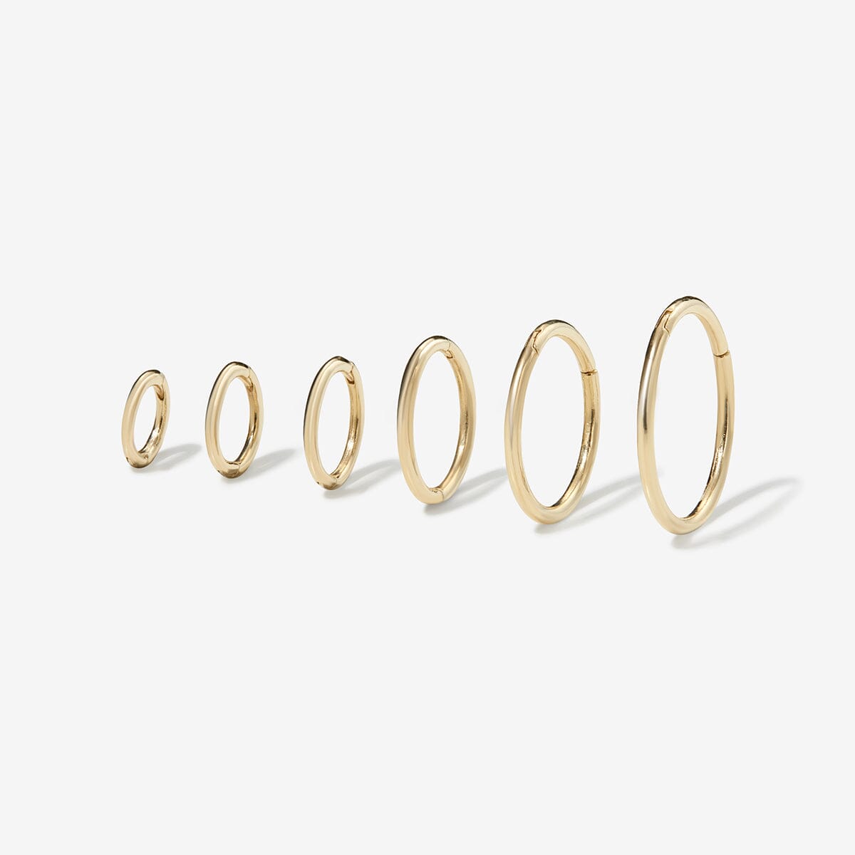 Hoop earrings with internal diameters of 4mm, 5mm, 6mm, 8mm, 10mm, and 12mm, in 18-gauge or 16-gauge thickness. Features a hinged clicker-style clasp, suitable for pierced ears.