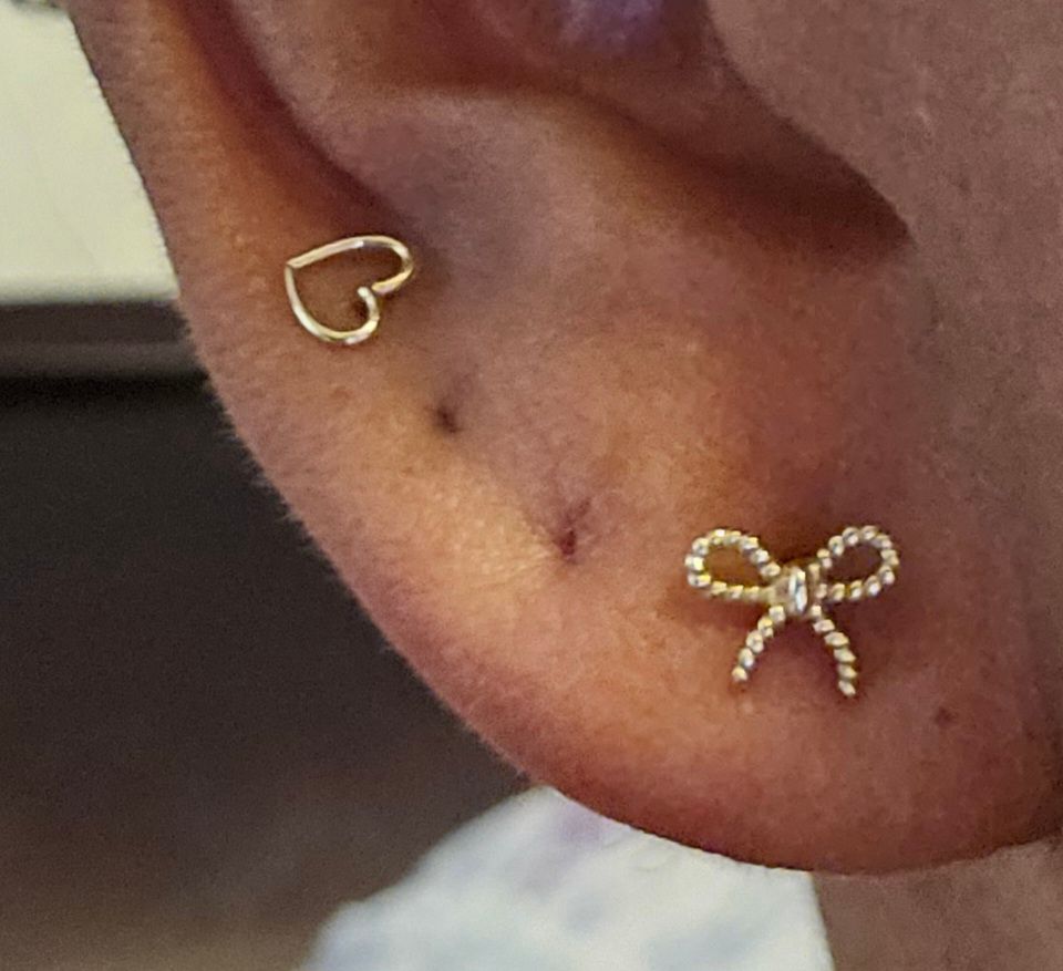 Girl meets grown up with these darling bow studs. Designed with beaded detailing for a touch of vintage and all the joys of metal. Now make it a triple threat with a cherry red lip and kitten heel . Created for you in 14 karat solid gold, this single piercing can stay in your ear always, even when you are in the water.